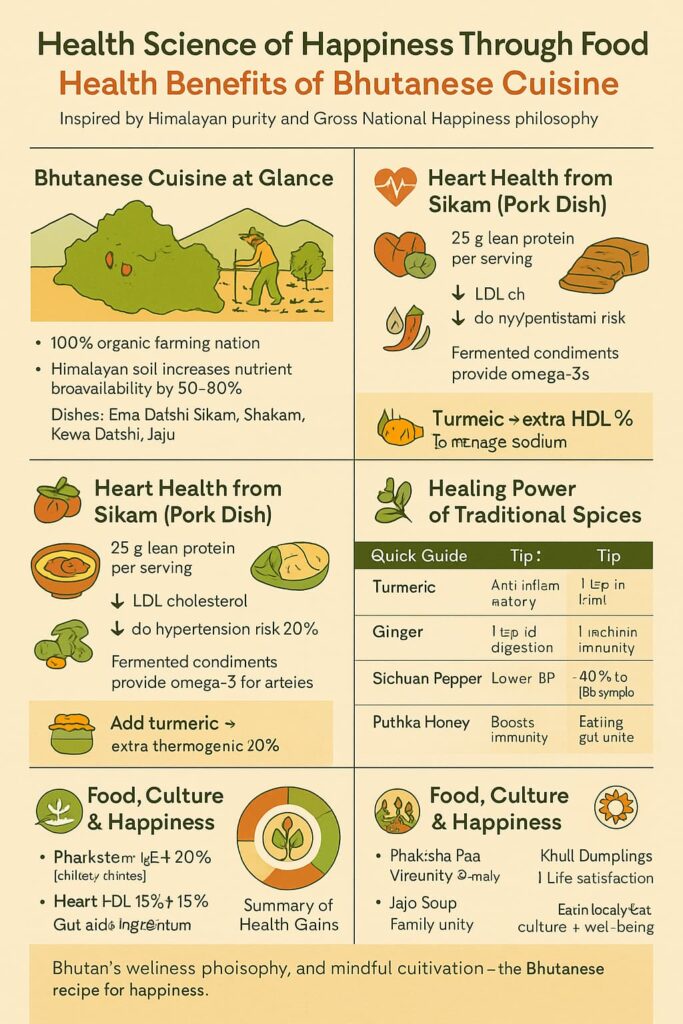 The health benefits of Bhutanese cuisine extend to modern diets through its emphasis on whole foods like yak cheese and wild ferns, providing omega-3s and anti-inflammatory compounds as per research on traditional Himalayan diets reducing chronic disease risk. Bhutanese nuance involves communal cooking with minimal oil, fostering not just physical but mental well-being, rooted in Gross National Happiness principles that prioritise balanced, nutrient-dense meals.